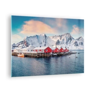 Cuadro sobre vidrio - Impresiones sobre Vidrio - Cabañas de pescadores rojas en el fiordo con montañas al fondo - 70x50cm - Un retiro en el norte - Decoración de pared moderna para salón y dormitorio ARTTOR