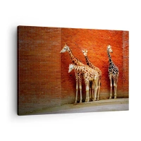 Cuadro sobre lienzo - Impresión de Imagen - Cuatro jirafas contra una pared de ladrillos en un entorno artístico. - 70x50cm - ¿Ves alguna acacia? - Decoración de pared moderna para salón y dormitorio ARTTOR