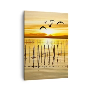 Cuadro sobre lienzo - Impresión de Imagen - Puesta de sol sobre el agua con pájaros en vuelo - 50x70cm - Horizonte naranja - Decoración de pared moderna para salón y dormitorio ARTTOR