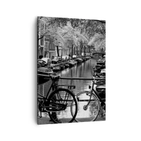 Cuadro sobre lienzo - Impresión de Imagen - Canal con bicicletas en fotografía en blanco y negro - 50x70cm - Una visión muy holandesa - Decoración de pared moderna para salón y dormitorio ARTTOR