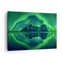 Cuadro sobre lienzo - Impresión de Imagen - Montañas rodeadas de auroras boreales reflejadas en el agua. - 70x50cm - En los brazos de la aurora - Decoración de pared moderna para salón y dormitorio ARTTOR