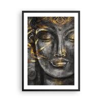 Póster en marco negro - Retrato de Buda con brillo dorado y elementos de hojas de bambú. - 50x70cm - Siente la paz - Decoración de pared moderna para salón y dormitorio ARTTOR