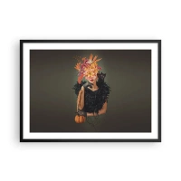 Póster en marco negro - Retrato de una mujer con un motivo floral sobre un fondo azul. - 70x50cm - Mujer-flor - Decoración de pared moderna para salón y dormitorio ARTTOR