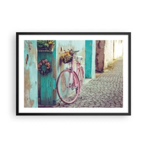 Póster en marco negro - Una bicicleta rosa junto a una puerta turquesa. - 70x50cm - Ahora mismo vuelvo - Decoración de pared moderna para salón y dormitorio ARTTOR