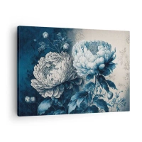 Cuadro sobre lienzo - Impresión de Imagen - Peonías azules sobre un fondo sutil con un patrón delicado. - 70x50cm - Una pareja unida - Decoración de pared moderna para salón y dormitorio ARTTOR