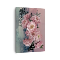 Cuadro sobre lienzo - Impresión de Imagen - Peonías rosas con una mariposa sobre un fondo pastel. - 50x70cm - La cúspide del romance - Decoración de pared moderna para salón y dormitorio ARTTOR