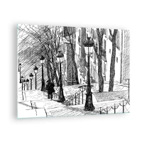 Cuadro sobre vidrio - Impresiones sobre Vidrio - Dibujo en blanco y negro de una calle de la ciudad con faroles. - 70x50cm - ¿Una historia de amor o de terror? - Decoración de pared moderna para salón y dormitorio ARTTOR