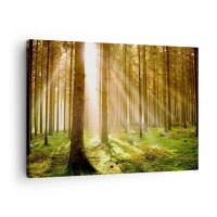 Cuadro sobre lienzo - Impresión de Imagen - Bosque de coníferas con rayos de sol brillando a través de los árboles. - 70x50cm - Los elfos se aproximan - Decoración de pared moderna para salón y dormitorio ARTTOR