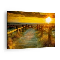 Cuadro sobre lienzo - Impresión de Imagen - Un camino de madera que conduce a la playa bajo el resplandor del sol poniente. - 70x50cm - Bañado en oro viejo - Decoración de pared moderna para salón y dormitorio ARTTOR