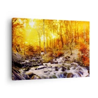 Cuadro sobre lienzo - Impresión de Imagen - Bosque otoñal con un arroyo entre hojas doradas - 70x50cm - Piedras bañadas en oro y platino - Decoración de pared moderna para salón y dormitorio ARTTOR