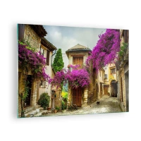 Cuadro sobre vidrio - Impresiones sobre Vidrio - Una calle pintoresca con flores en macetas. - 70x50cm - En un torrente de flores - Decoración de pared moderna para salón y dormitorio ARTTOR