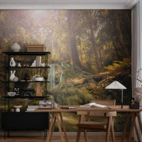Fotomural Premium Sand - Una pintoresca cascada rodeada de un bosque otoñal. - 100x70cm - Cascada forestal en verde - Decoración de pared moderna para salón y dormitorio ARTTOR