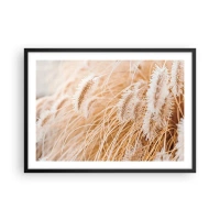 Póster en marco negro - Primer plano de hierbas delicadas y doradas a la luz del sol. - 70x50cm - El dorado susurro de las hierbas - Decoración de pared moderna para salón y dormitorio ARTTOR
