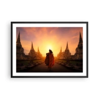 Póster en marco negro - Un monje entre los templos al atardecer. - 70x50cm - En paz por la eternidad - Decoración de pared moderna para salón y dormitorio ARTTOR