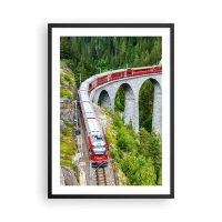 Póster en marco negro - Un tren rojo en un viaducto rodeado de un bosque verde. - 50x70cm - Atravesando las montañas - Decoración de pared moderna para salón y dormitorio ARTTOR