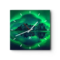 Reloj de pared - Reloj de vidrio - Montañas rodeadas de auroras boreales reflejadas en el agua. - 30x30cm - En los brazos de la aurora - Decoración de pared moderna para salón y dormitorio ARTTOR