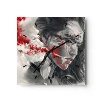 Reloj de pared - Reloj de vidrio - Retrato artístico de una mujer con acentos rojos abstractos. - 30x30cm - En los humos del absurdo - Decoración de pared moderna para salón y dormitorio ARTTOR