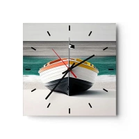 Reloj de pared - Reloj de vidrio - Un barco en la playa con un mar turquesa al fondo. - 30x30cm - En su lugar exacto - Decoración de pared moderna para salón y dormitorio ARTTOR
