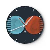 Reloj de pared - Reloj de vidrio - Una combinación de círculos azules y rojos con líneas geométricas. - 30x30cm - ¿Solo geometría? - Decoración de pared moderna para salón, cocina y dormitorio ARTTOR