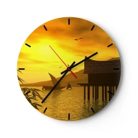 Reloj de pared - Reloj de vidrio - Puesta de sol sobre el lago con una casa sobre pilotes - 30x30cm - La ansiada paz - Decoración de pared moderna para salón, cocina y dormitorio ARTTOR