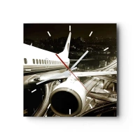 Reloj de pared - Reloj de vidrio - Aeropuerto con siluetas de personas y una vista del avión. - 30x30cm - Vis a vis en el aeropuerto - Decoración de pared moderna para salón y dormitorio ARTTOR