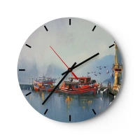 Reloj de pared - Reloj de vidrio - Un puerto con barcos rojos en aguas tranquilas por la mañana. - 30x30cm - En el fin del mundo - Decoración de pared moderna para salón, cocina y dormitorio ARTTOR