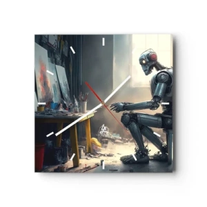 Reloj de pared - Reloj de vidrio - Un robot pintando un cuadro en un estudio de arte. - 30x30cm - El acto de creación - Decoración de pared moderna para salón y dormitorio ARTTOR