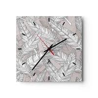 Reloj de pared - Reloj de vidrio - Patrón en blanco y negro con hojas de plátano sobre un fondo claro. - 30x30cm - Turbulencias de plumas - Decoración de pared moderna para salón y dormitorio ARTTOR