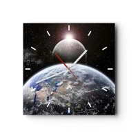 Reloj de pared - Reloj de vidrio - El planeta Tierra y la Luna con el espacio exterior estrellado como telón de fondo. - 30x30cm - Paisaje cósmico - amanecer - Decoración de pared moderna para salón y dormitorio ARTTOR