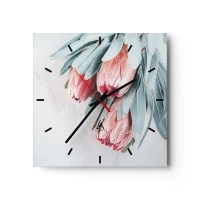 Reloj de pared - Reloj de vidrio - Sutiles flores de protea rosa sobre un fondo claro. - 30x30cm - Avergonzada de su propia belleza - Decoración de pared moderna para salón y dormitorio ARTTOR