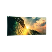 Cuadro sobre vidrio - Impresiones sobre Vidrio - Una ola con el sol poniente y nubes iluminadas. - 120x50cm - Surfer, ¿dónde estás? - Decoración de pared moderna para salón y dormitorio ARTTOR