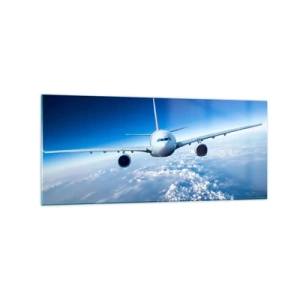 Cuadro sobre vidrio - Impresiones sobre Vidrio - Un avión volando sobre las nubes contra un cielo azul. - 120x50cm - Vuelo porque quiero - Decoración de pared moderna para salón y dormitorio ARTTOR