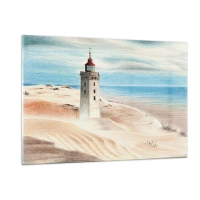 Cuadro sobre vidrio - Impresiones sobre Vidrio - Un faro en una duna del desierto junto a un mar en calma - 120x80cm - Siempre mirando al mar - Decoración de pared moderna para salón y dormitorio ARTTOR