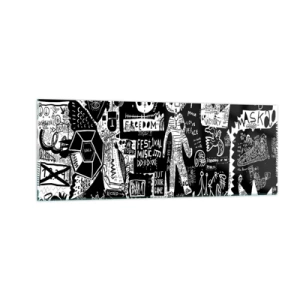 Cuadro sobre vidrio - Impresiones sobre Vidrio - Collage en blanco y negro inspirado en el arte callejero - 140x50cm - La juventud espiritual de la ley y la alegría - Decoración de pared moderna para salón y dormitorio ARTTOR