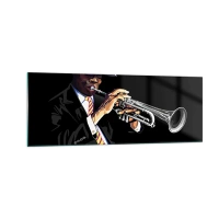 Cuadro sobre vidrio - Impresiones sobre Vidrio - Un músico tocando la trompeta sobre un fondo negro. - 140x50cm - El encanto de la vieja escuela - Decoración de pared moderna para salón y dormitorio ARTTOR
