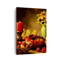 Cuadro sobre lienzo - Impresión de Imagen - Bodegón con fruta, pan, vela y flores. - 50x70cm - Bodegón con pan y fruta - Decoración de pared moderna para salón y dormitorio ARTTOR