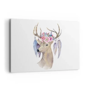 Cuadro sobre lienzo - Impresión de Imagen - Gráfico romántico de ciervo con flores y plumas. - 120x80cm - Guía del alma - gentil, inocente - Decoración de pared moderna para salón y dormitorio ARTTOR