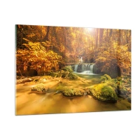 Cuadro sobre vidrio - Impresiones sobre Vidrio - Cascada forestal en oro - 120x80cm - Cascada forestal en oro - Decoración de pared moderna para salón y dormitorio ARTTOR