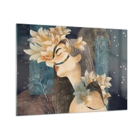 Cuadro sobre vidrio - Impresiones sobre Vidrio - Una figura femenina con lirios en estilo de cuento de hadas. - 100x70cm - Cuento de princesa con lirios - Decoración de pared moderna para salón y dormitorio ARTTOR