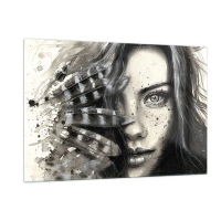 Cuadro sobre vidrio - Impresiones sobre Vidrio - Retrato de una mujer con plumas y detalles abstractos. - 120x80cm - Belleza salvaje - Decoración de pared moderna para salón y dormitorio ARTTOR