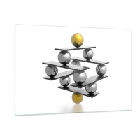 Cuadro sobre vidrio - Impresiones sobre Vidrio - Composición geométrica con bolas y plataformas sobre fondo blanco. - 120x80cm - Balance de oro y plata - Decoración de pared moderna para salón y dormitorio ARTTOR