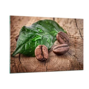 Cuadro sobre vidrio - Impresiones sobre Vidrio - Granos de café sobre un fondo de hojas y madera. - 120x80cm - El auténtico y negro - Decoración de pared moderna para salón y dormitorio ARTTOR