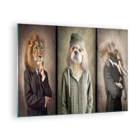 Cuadro sobre vidrio - Impresiones sobre Vidrio - Tres animales con ropa elegante sobre un fondo estilizado. - 70x50cm - ¿Qué estoy haciendo aquí? - Decoración de pared moderna para salón y dormitorio ARTTOR