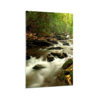 Cuadro sobre vidrio - Impresiones sobre Vidrio - Un arroyo forestal que fluye entre piedras rodeadas de vegetación. - 80x120cm - Como plata líquida - Decoración de pared moderna para salón y dormitorio ARTTOR
