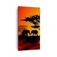 Fotomural Premium Canvas - Atardecer africano con siluetas de elefantes y jirafas sobre el agua - 100x70cm - Reunión en la sabana - Decoración de pared moderna para salón y dormitorio ARTTOR