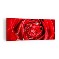 Cuadro sobre lienzo - Impresión de Imagen - Primer plano de una rosa roja con gotas de agua en los pétalos. - 160x50cm - En gotas de rocío - Decoración de pared moderna para salón y dormitorio ARTTOR