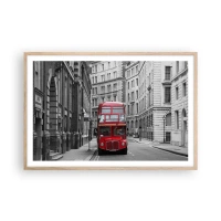 Cuadro sobre lienzo - Impresión de Imagen - Un autobús rojo sobre un fondo de edificios de la ciudad en blanco y negro. - 70x100cm - La vida cotidiana no tiene por qué ser gris - Decoración de pared moderna para salón y dormitorio ARTTOR