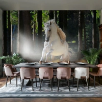 Fotomural Premium Sand - Un caballo blanco galopando a través de un claro del bosque. - 100x70cm - Como en una novela de fantasía - Decoración de pared moderna para salón y dormitorio ARTTOR