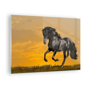 Cuadro sobre vidrio - Impresiones sobre Vidrio - Un caballo negro galopando contra el sol poniente. - 70x50cm - Hermoso, libre y salvaje - Decoración de pared moderna para salón y dormitorio ARTTOR