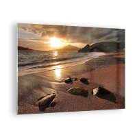Cuadro sobre vidrio - Impresiones sobre Vidrio - Puesta de sol sobre una playa rocosa y colinas - 70x50cm - Sigue el sol hacia las colinas - Decoración de pared moderna para salón y dormitorio ARTTOR